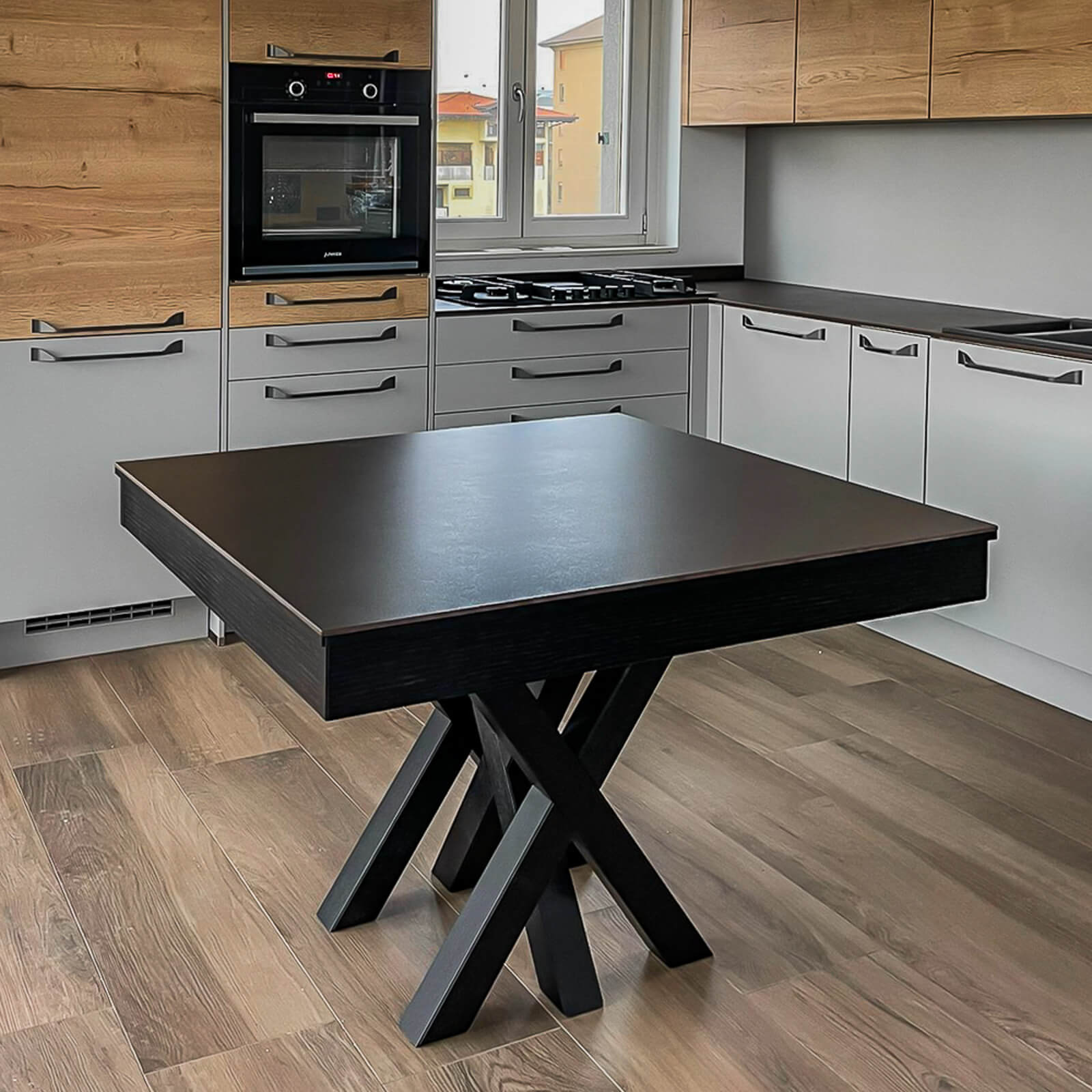 Bernini combines wood and aluminum, creating a table that lasts over time, with a load capacity of up to 120 kg/m² even at maximum extension. Weighing about 50 kg, it is solid and stable yet easy to maneuver.