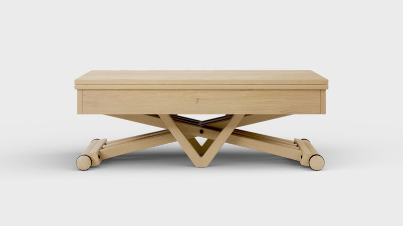 The table features a rotating mechanism and a foldable top. Thanks to its lifting and rotating system, it can be used as a coffee table, workspace, or dining table (for up to 6 or 8 people), without taking up too much space. Simply lift the table and lock it at the desired height; then, rotate the tabletop 90° and open it like a "book". Stability is ensured by reinforced hinges.