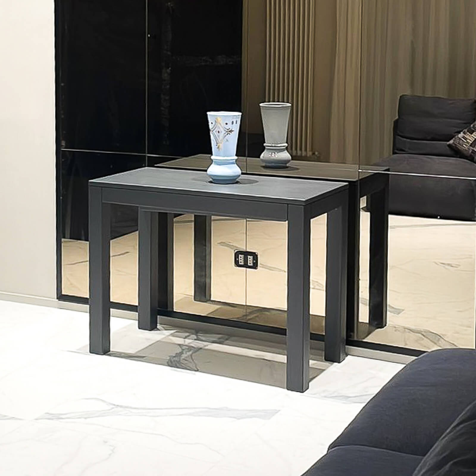 Functional Design: The table has a depth of just 35 cm, making it ideal for small spaces. Additionally, the console tables are equipped with a special mechanism that allows the central support legs to disappear when the table is closed.
